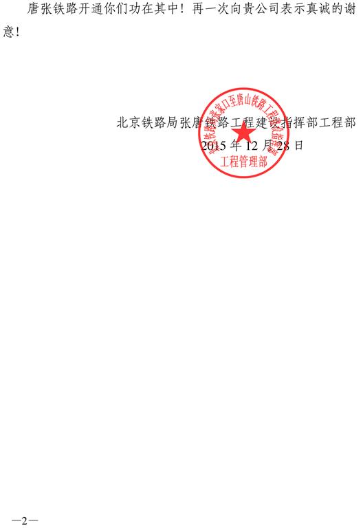 北京鐵路局張?zhí)畦F路工程建設(shè)指揮部工程部向我司發(fā)來感謝信